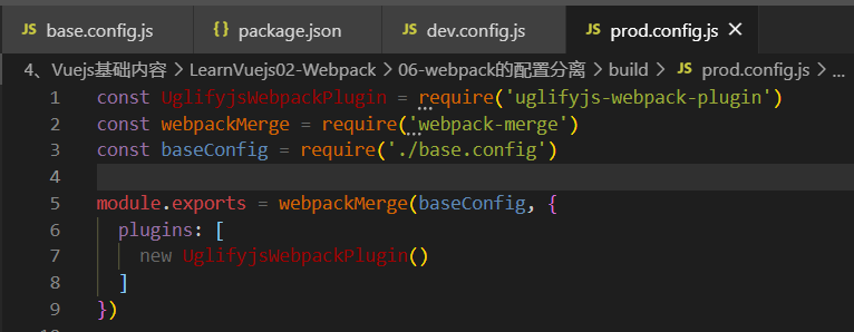 4.2.3 prod.config.js+base.config.js合并:导入webpack-merge包+公共配置,进行合并