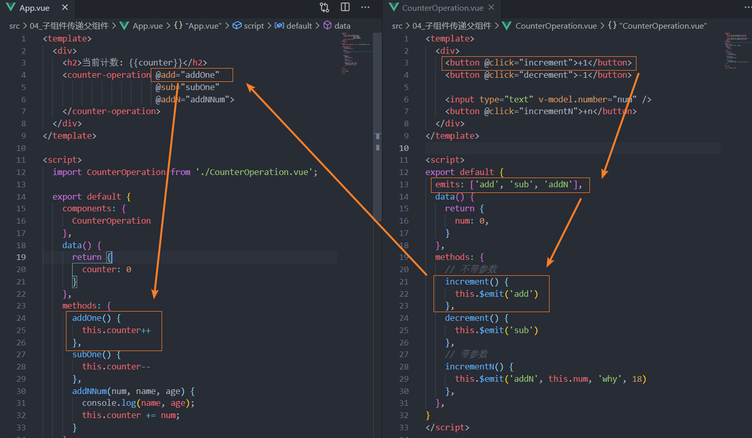 - 子组件文件:监听事件@click + 事件中发出emit + 定义emits属性(vue3)