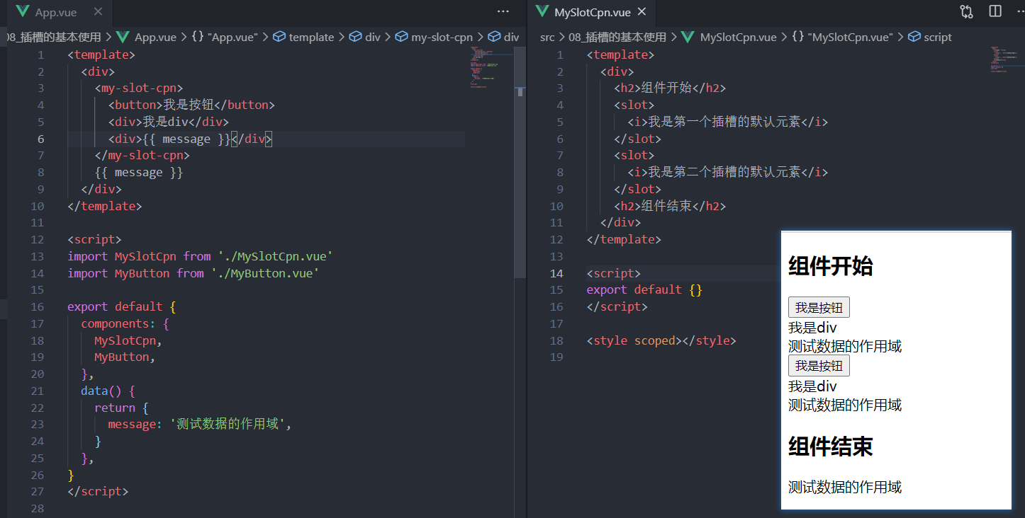 - 父组件:<template v-slot:left> <button>左边的按钮</button> </template>,可以简写:<template #left> <button>左边的按钮</button> </template>