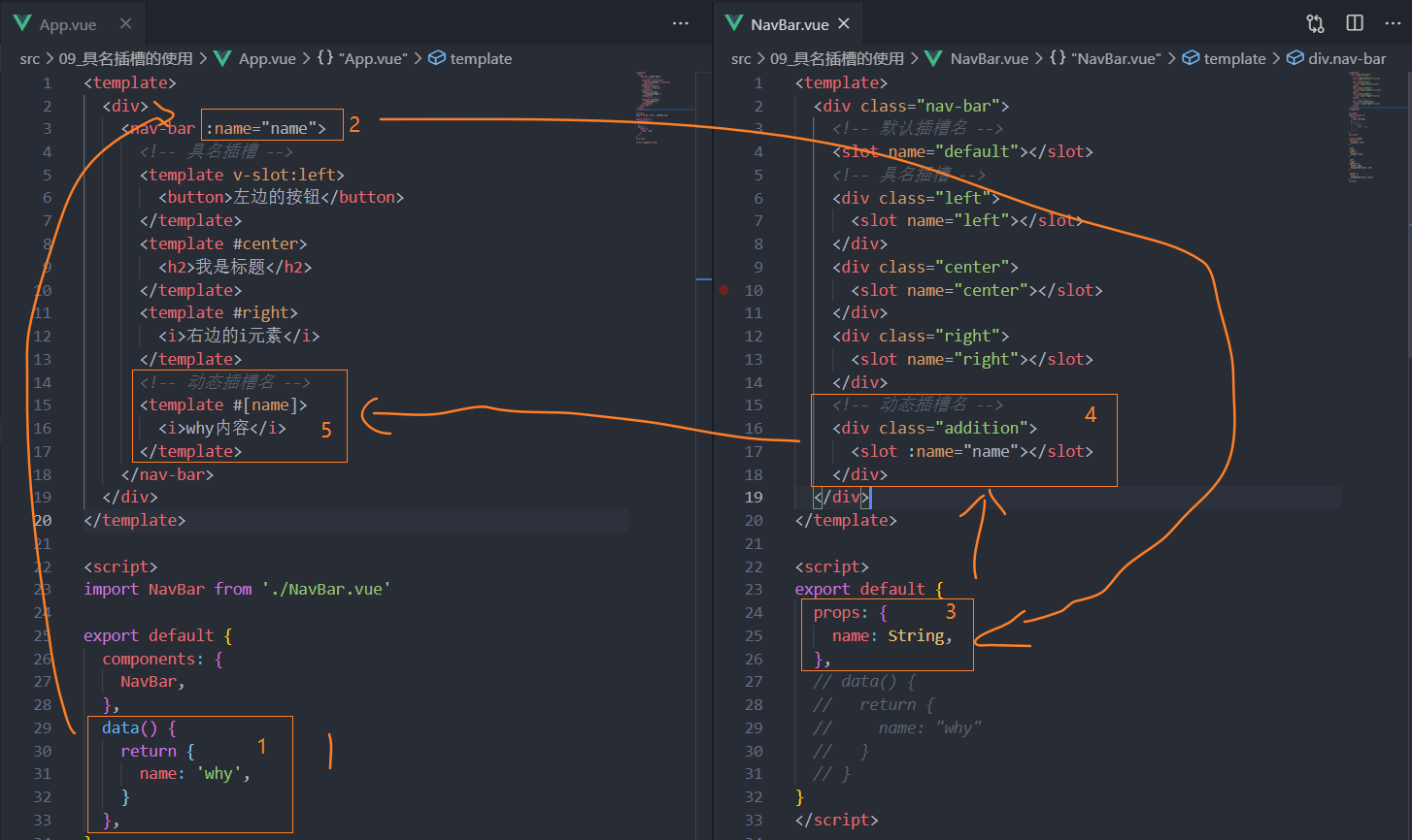 - 目前我们使用的插槽名称都是固定的,比如 v-slot:left等等,我们可以通过 v-slot:[dynamicSlotName]方式动态绑定一个名称
