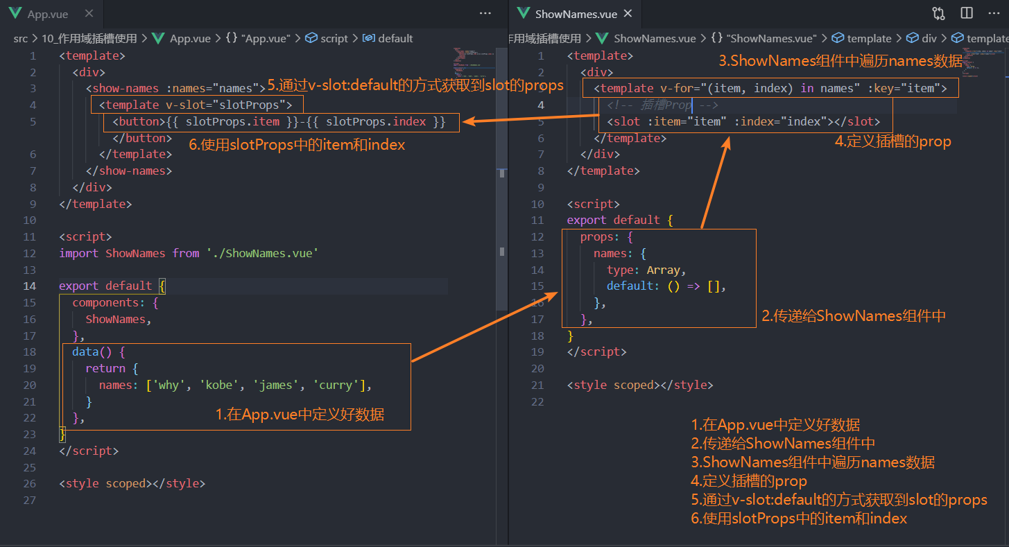 - 子组件中定义slot插槽:<slot :item="item" :index="index"></slot>