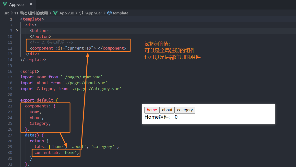 1.概念:动态组件是使用 component 组件,通过一个特殊的attribute is 来实现