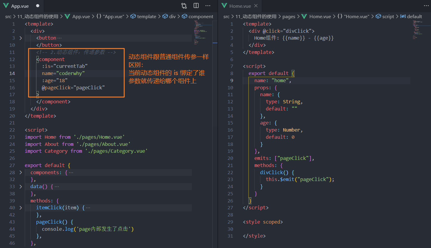 区别:当前动态组件的 is 绑定哪个组件,参数就在哪个组件上