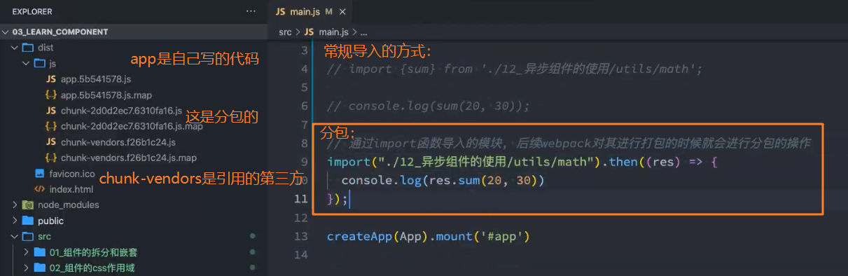 - 所以,对于一些不需要立即使用的组件,我们可以单独对它们进行拆分,拆分成一些小的代码块chunk.js