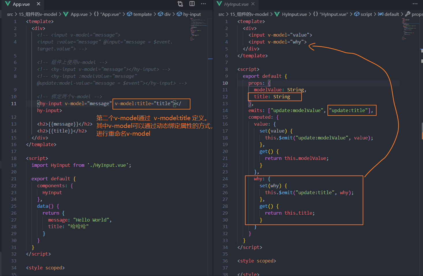 - v-model默认帮助我们完成了两件事:v-bind:modelValue的数据绑定和@update:model-value的事件监听