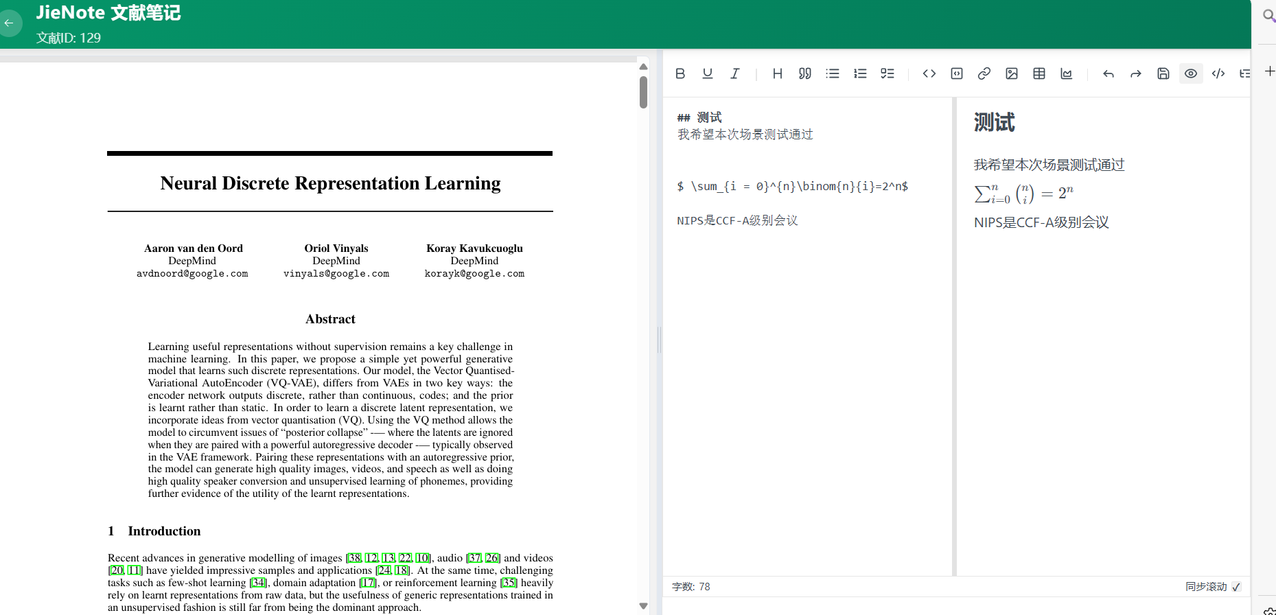 支持上传文献、撰写Markdown笔记,并在文献详情页预览笔记内容。用户可随时修改或删除笔记。