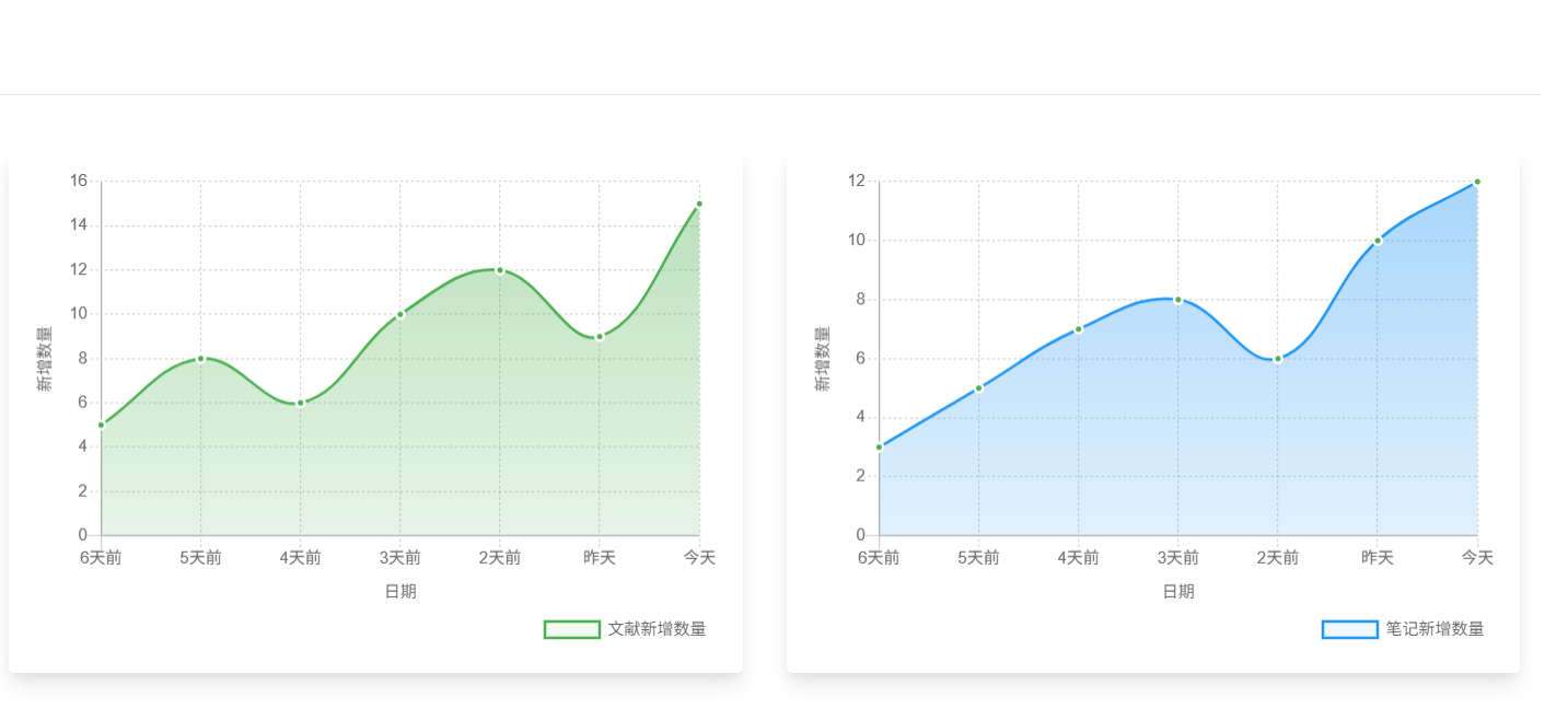个人主页展示文献/笔记统计面板,通过折线图直观呈现学习进度趋势。