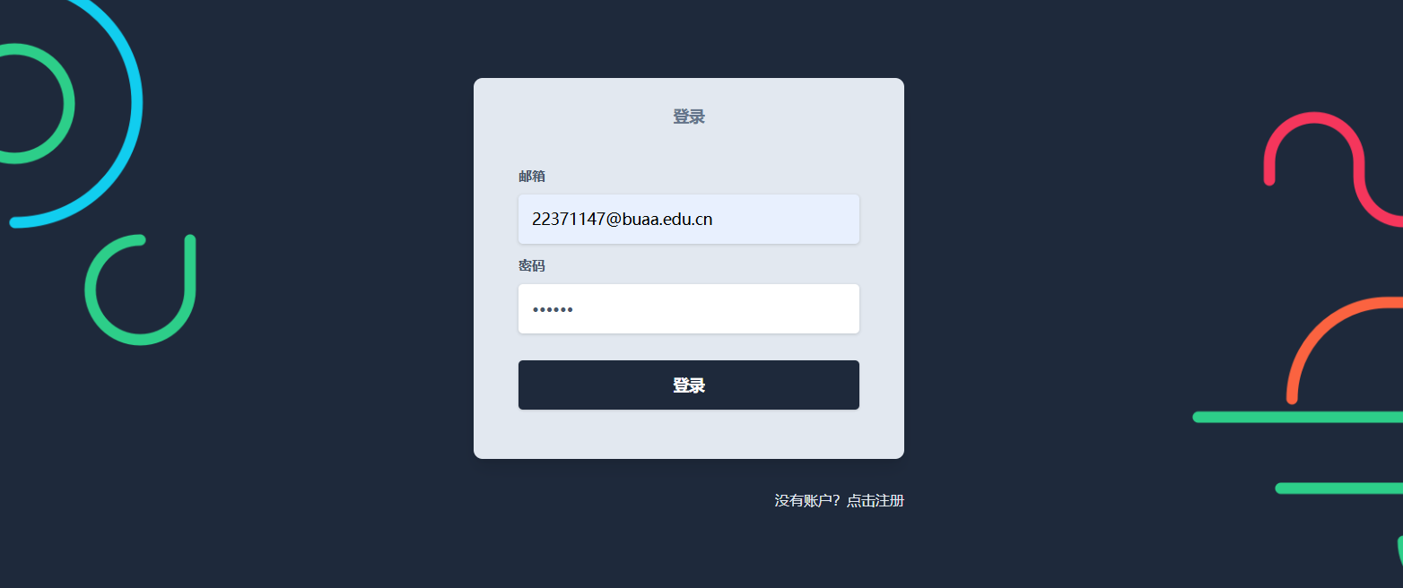 注册后,可以用注册时的邮箱登录,输入正确的邮箱和密码即可。登录后会将用户令牌存储在本地,以实现鉴权。