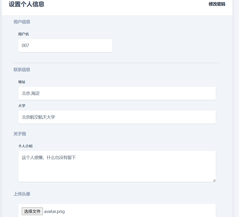 007想完善一下自己的个人信息,他去填写自己的地址、大学、个人介绍和头像,还可以在必要时修改自己的密码