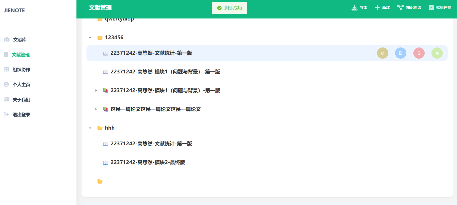之后根据左侧的工具栏,选择对应的功能进行操作,包括文献管理、笔记管理、组织管理、个人主页等