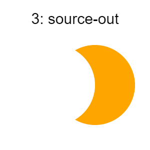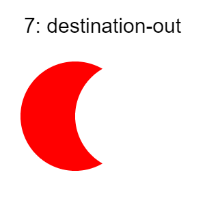 | source-out 只保留新、旧图像的非重叠的新圆形区域,其余为透明。 | ![]() | destination-out 只保留新、旧图像的非重叠的旧圆形区域,其余为透明。 | ![]() |