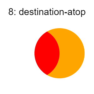 | source-atop 新圆形只在绘制新、旧图像重叠的新圆形区域,然后盖在旧图形之上 | ![]() | destination-atop 旧图形只保留在新、旧图形重叠的旧圆形区域,然后盖在新圆形之上。 | ![]() |