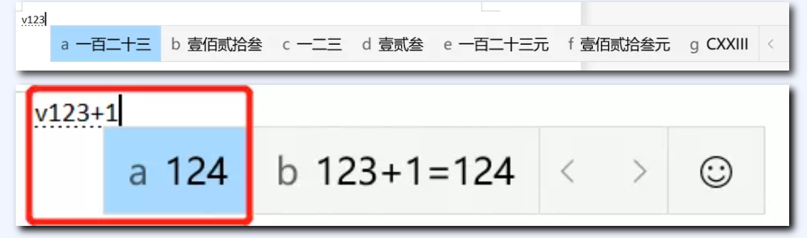 中文状态下,键盘上输入【v123】,就会显示123的中文大小写各种形式;输入【v123+1】,就会直接计算出答案124。(大家也可以试试v+其它数字~)