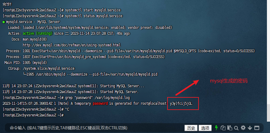 # 1)前往用户根目录 cd ~ # 2)下载mysql57 wget http://dev.mysql.com/get/mysql57-community-release-el7-10.noarch.rpm # 也可以本地上传,这条命令要在本地终端上执行 # scp -r C:mysql57-community-release-el7-10.noarch.rpm root@39.99.192.127:~ # 3)安装mysql57 yum -y install mysql57-community-release-el7-10.noarch.rpm yum -y install mysql-community-server # 4)启动mysql57并查看启动状态 systemctl start mysqld.service systemctl status mysqld.service # 5)查看默认密码并登录 grep "password" /var/log/mysqld.log mysql -uroot -p # 6)修改密码 ALTER USER 'root'@'localhost' IDENTIFIED BY 'new password';
