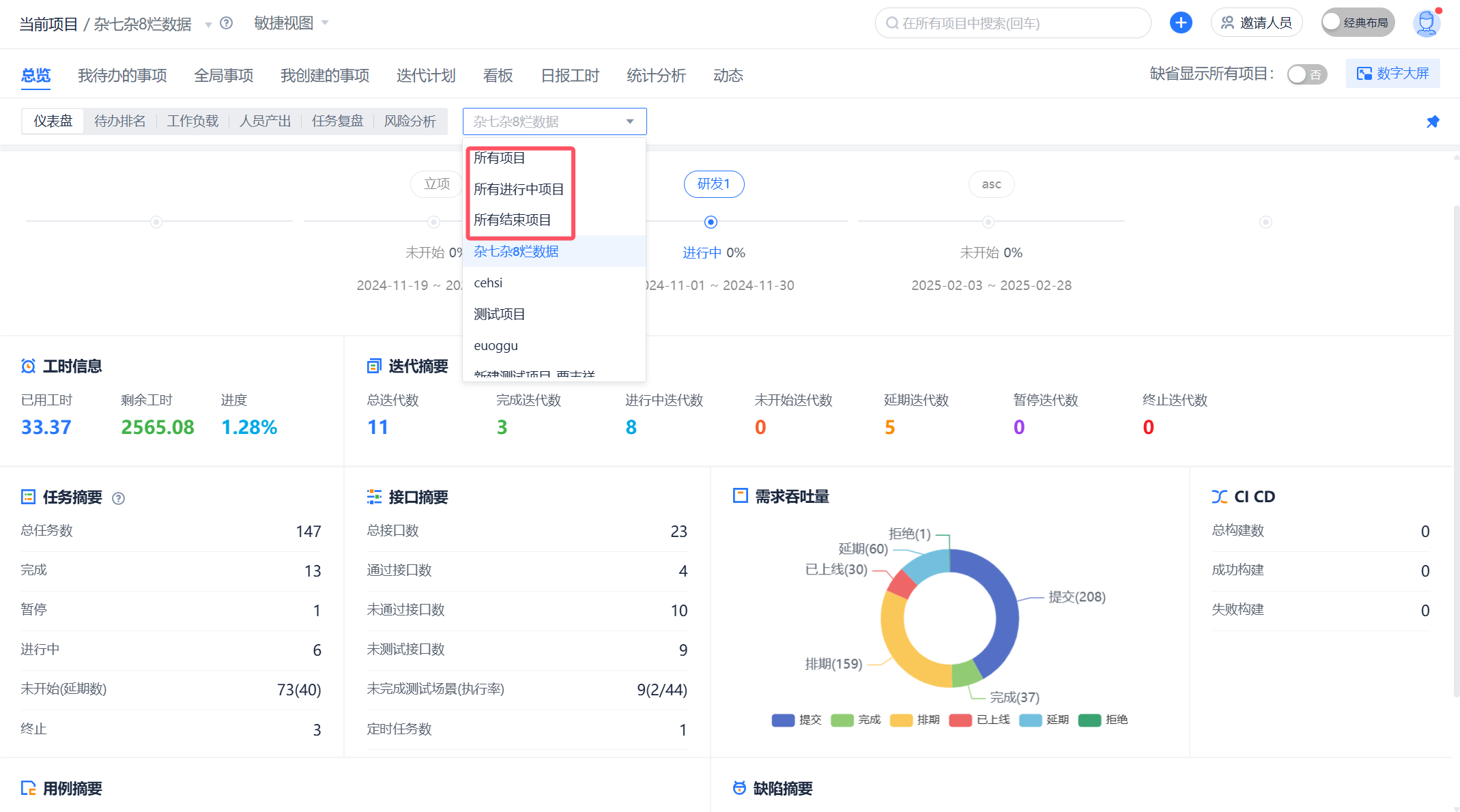 功能全面:需求池、原型管理、工单管理、工作汇报、需求管理、任务管理、测试管理、缺陷管理、自动化测试、项目文档、工时进度管理、风险管理、项目管理(支持多种模式),统计分析等。