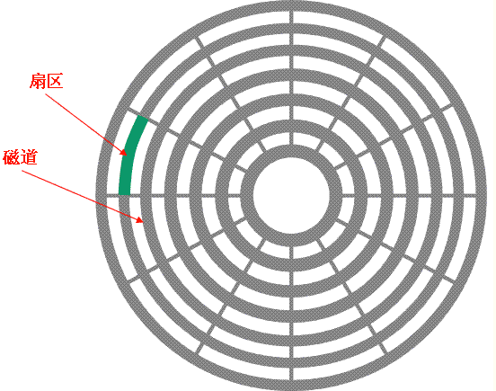 下图显示的是一个盘面,盘面中一圈圈灰色同心圆为一条条磁道,从圆心向外画直线,可以将磁道划分为若干个弧段,每个磁道上一个弧段被称之为一个扇区(图践绿色部分)。扇区是磁盘的最小组成单元,通常是512字节。(由于不断提高磁盘的大小,部分厂商设定每个扇区的大小是4096字节)