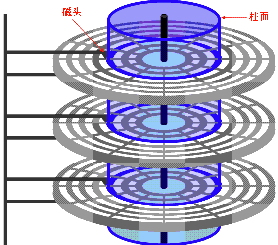 硬盘通常由重叠的一组盘片构成,每个盘面都被划分为数目相等的磁道,并从外缘的“0”开始编号,具有相同编号的磁道形成一个圆柱,称之为磁盘的柱面。磁盘的柱面数与一个盘面上的磁道数是相等的。由于每个盘面都有自己的磁头,因此,盘面数等于总的磁头数。 如下图: