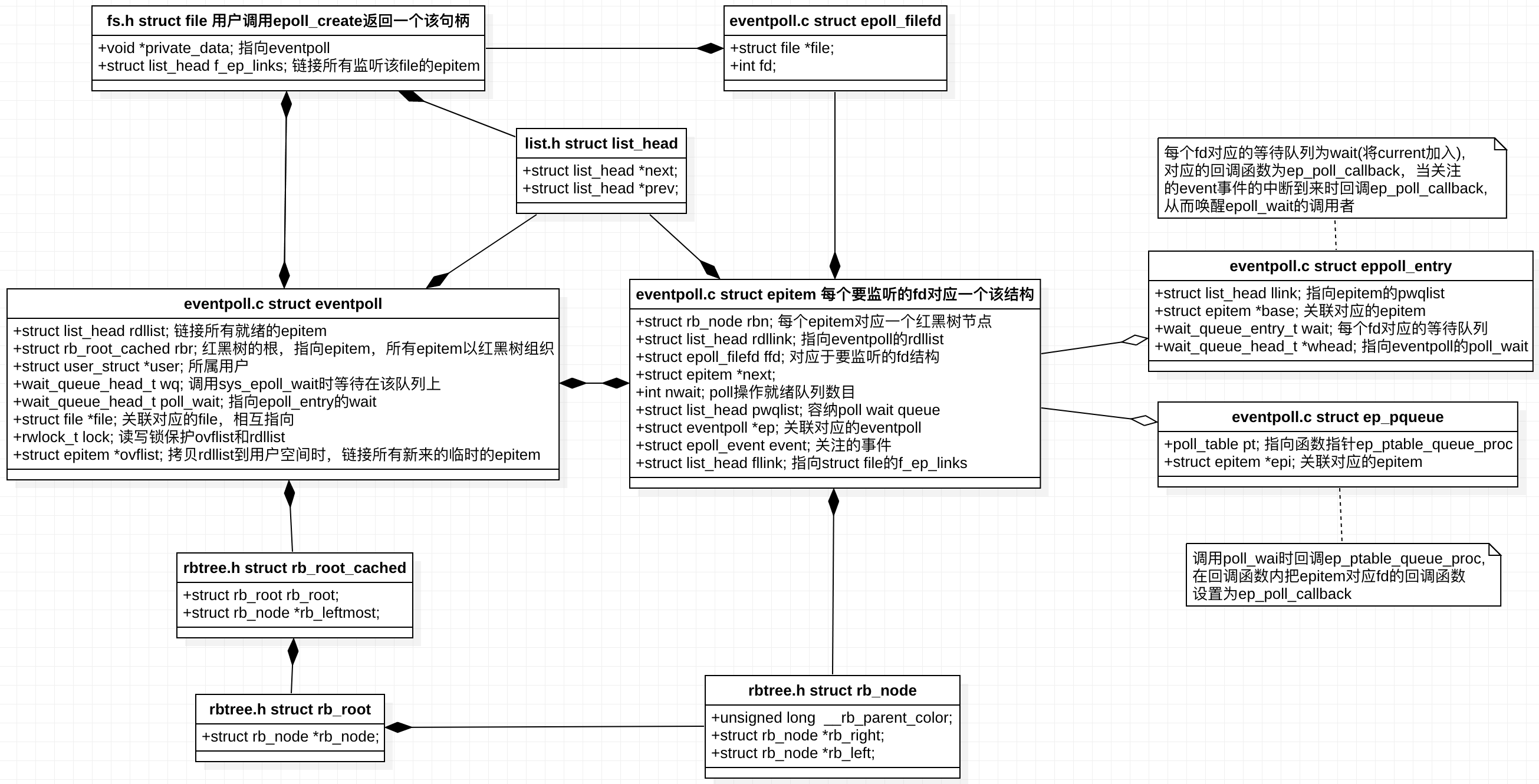 static int ep_poll_readyevents_proc(void *priv, void *cookie, int call_nests) { struct readyevents_arg *arg = priv; // 判断当前有没有事件触发 return ep_scan_ready_list(arg->ep, ep_read_events_proc, NULL, call_nests + 1, arg->locked); } static unsigned int ep_eventpoll_poll(struct file *file, poll_table *wait) { int pollflags; struct eventpoll *ep = file->private_data;// 被监听的epoll struct readyevents_arg arg; /* * During ep_insert() we already hold the ep->mtx for the tfile. * Prevent re-aquisition. */ arg.locked = wait && (wait->_qproc == ep_ptable_queue_proc); arg.ep = ep; /* Insert inside our poll wait queue */ poll_wait(file, &ep->poll_wait, wait);//// 插入到wait_queue /* * Proceed to find out if wanted events are really available inside * the ready list. This need to be done under ep_call_nested() * supervision, since the call to f_op->poll() done on listed files * could re-enter here.、