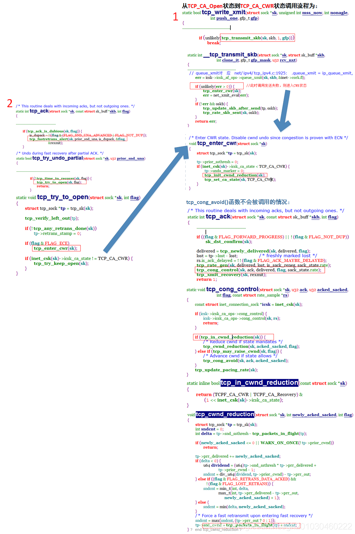1)当发送一个数据包时,使用tcp_write_xmit发送,调用tcp_transmit_skb()后转调ip_queue_xmit将ip数据包发送出去时,如果失败了,则进入CRW状态。当处于CWR状态时,tcp_cong_avoid()函数不会被调用,由于cwnd在这个函数中被快速增长,所以在CWR状态中,cwnd值不会被快速增长,只会被缓慢减少在一个范围内