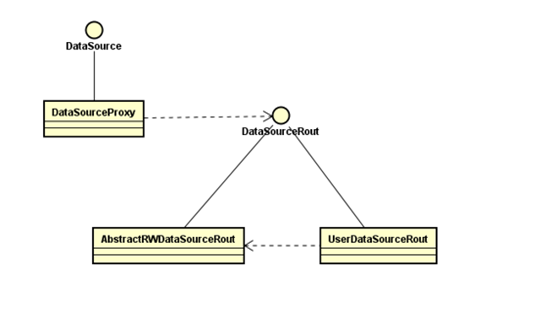 DataSourceRout 接口目前有两个实现类,AbstractRWDataSourceRout 实现读写分离,UserDataSourceRout 实现根据不同的用户路由到不同的数据库组上。UserDataSourceRout 这个类依赖一组 AbstractRWDataSourceRout,实现读写分离。
