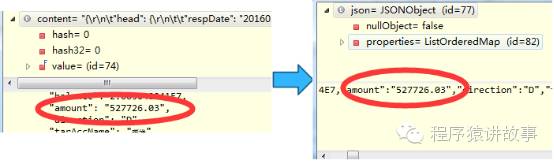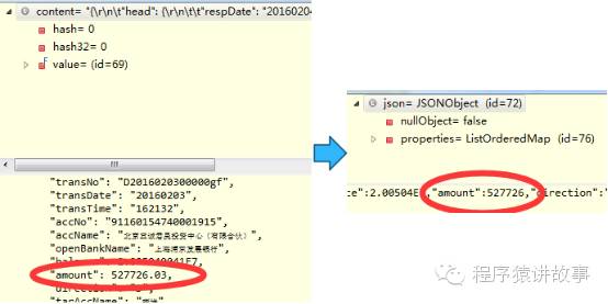 在转换前后,金额从 527726.03 变成了527726,这个差异符合前面观察到的错误现象。仔细查看json字符串,发现金额没有使用双引号括起来,说明生成json的时候,直接赋值的是金额,而不是转成字符串后再赋值。