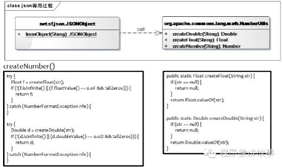 负责开发账户的同事,下载了json-lib的源码,进行了进一步的跟踪调试,更准确的定位到了出错的位置:是在调用commons-lang.jar中的NumberUtils类中代码时出错。下图是一个简单的调用过程。