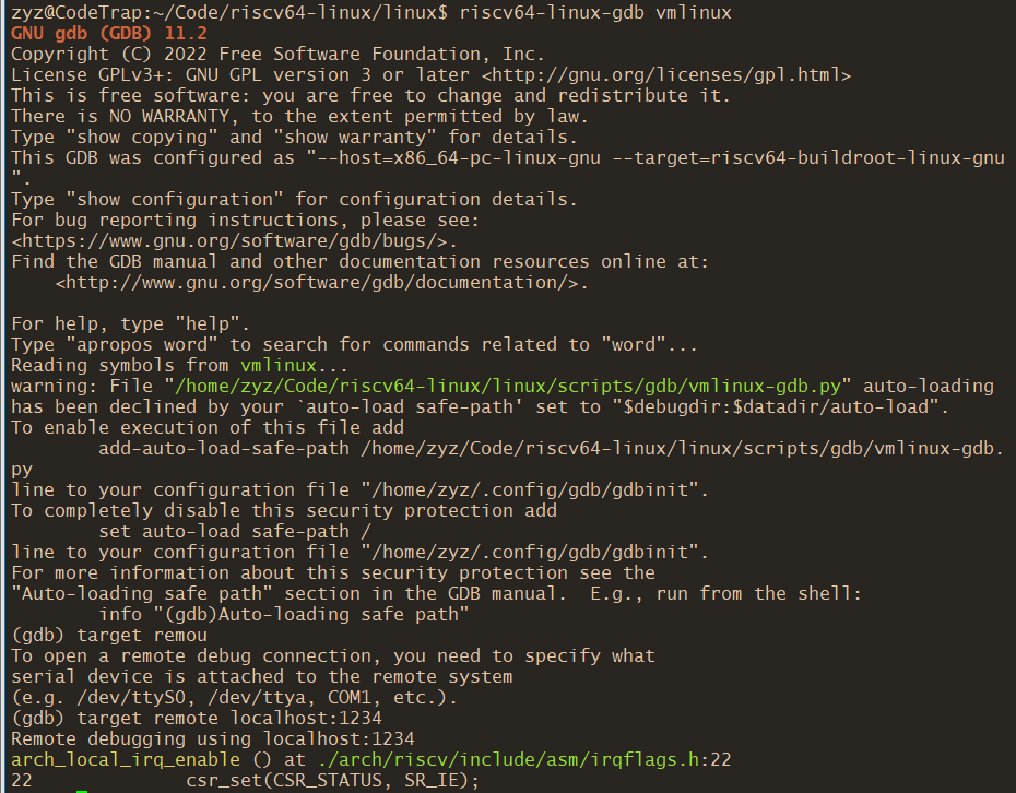 主机端调试,使用riscv64-linux-gdb调试编译kernel后生成的vmlinux。