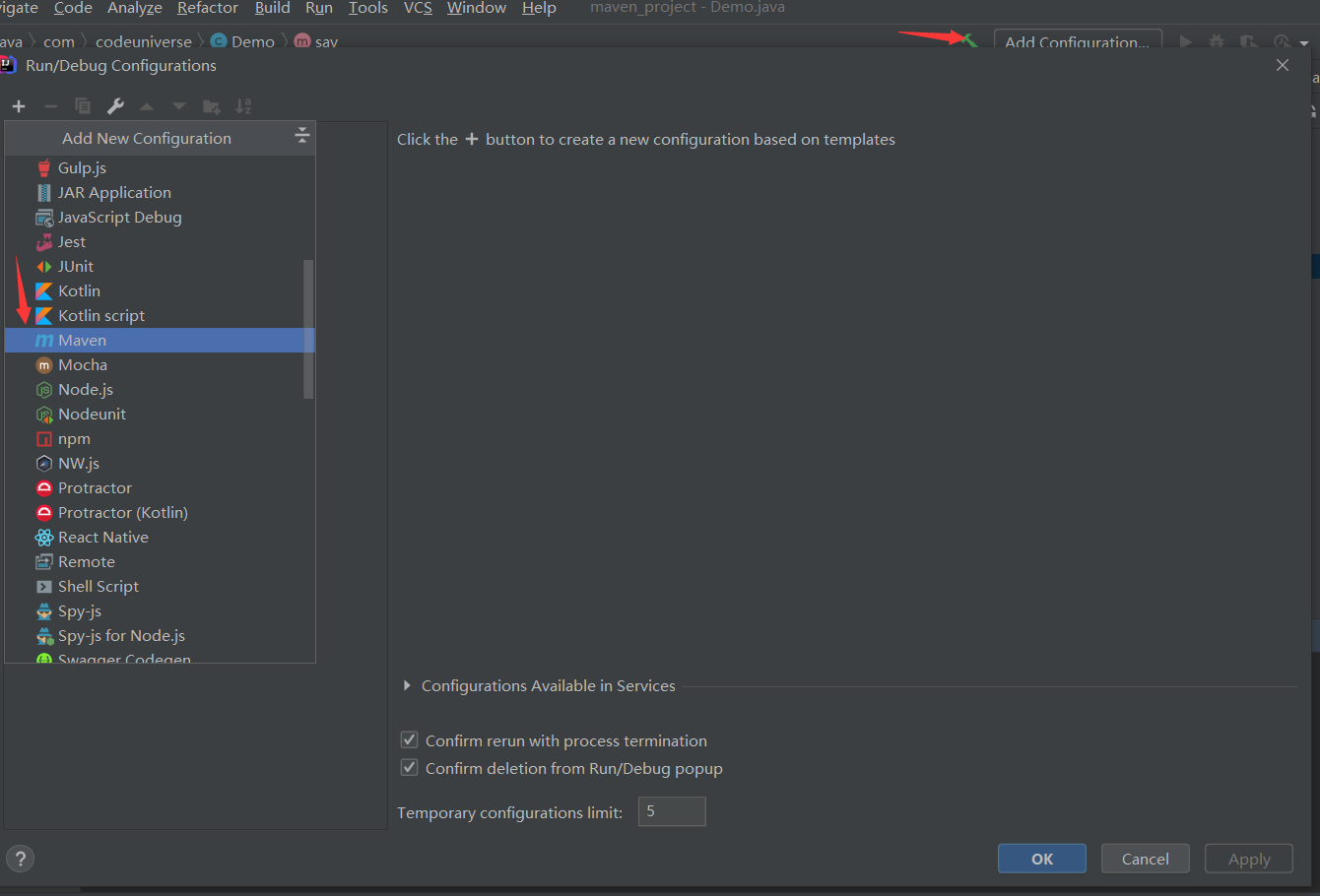 也可以点击上方的锤子选择Maven,添加命令在执行达到一样的效果(优点:可以使用debug模式运行)