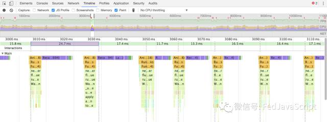 优化前的代码对DOM操作很频繁,因此FPS值普遍偏低,而优化后可以看出红色方块明显减少,FPS值一直处于高值。