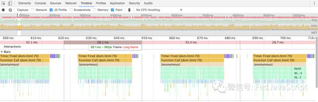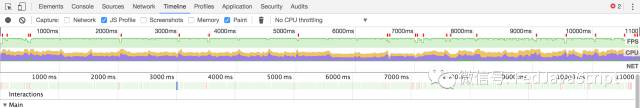 CPU:第二栏为CPU,蓝色表示loading(网络通信和HTML解析),黄色表示scripting(js执行时间),紫色表示rendering(样式计算和布局,即重排), 绿色为painting(即重绘)。