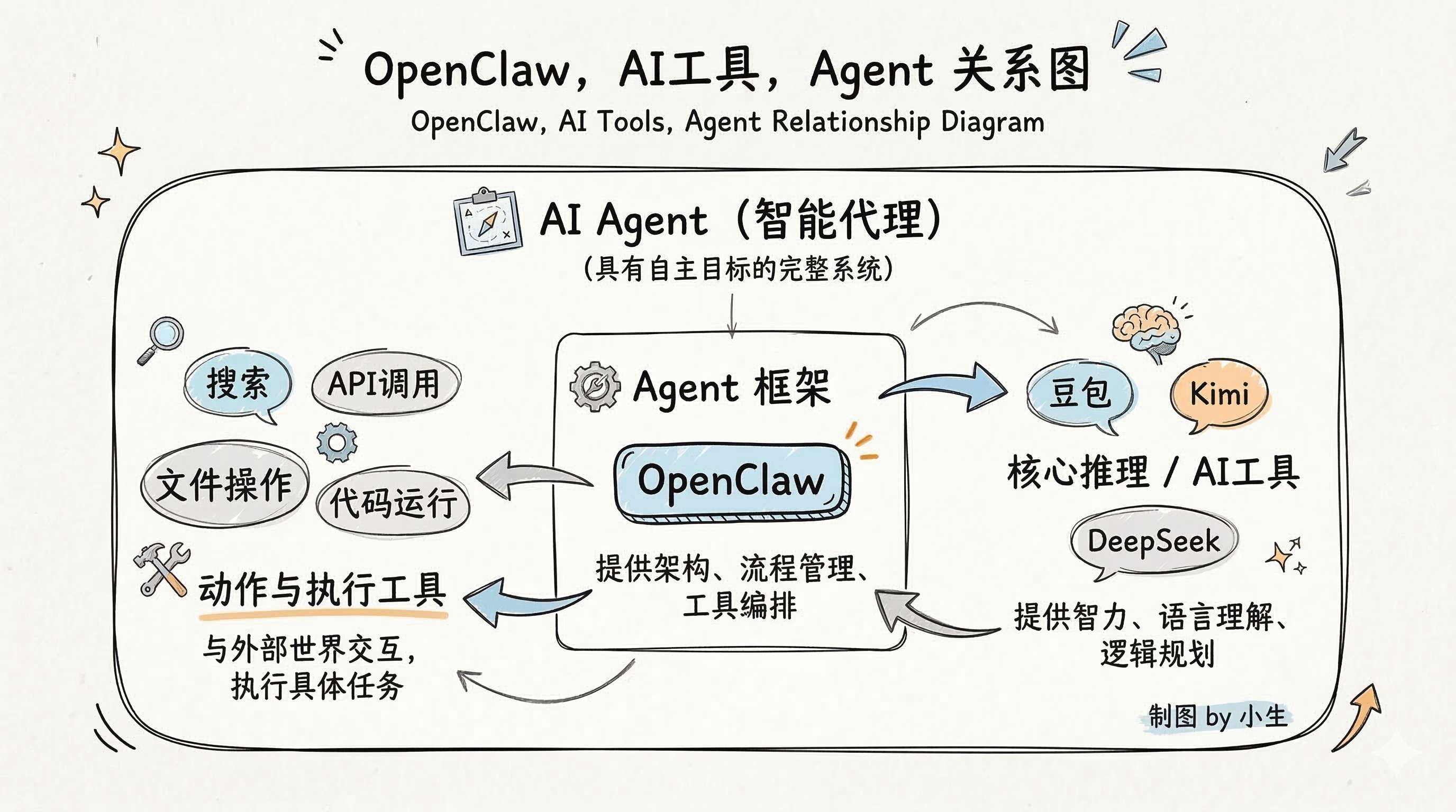 三、OpenClaw 与 AI 工具(DeepSeek/Kimi/豆包)的关系