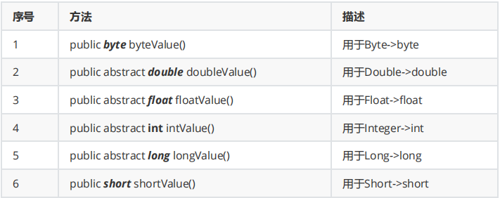 因为所有的数值型的包装类都是Number的子类,Number的类中定义了如下的操作方法,以下的全部方法都