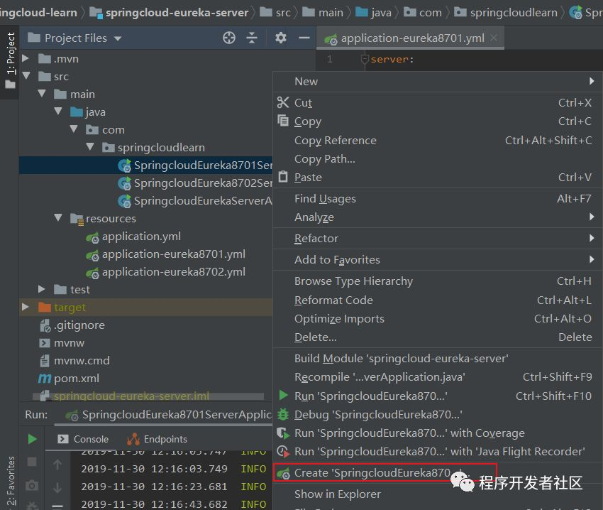2、复制SpringcloudEurekaServerApplication启动类命名为SpringcloudEureka8701ServerApplication,SpringcloudEureka8702ServerApplication,鼠标放在启动类上右键选择如图