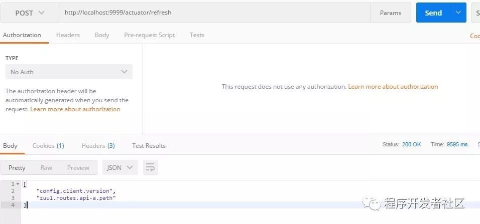 然后发送post请求zuul的refresh端点进行配置刷新http://localhost:9999/actuator/refresh
