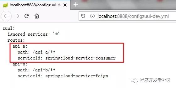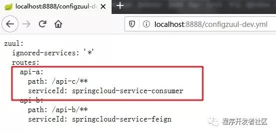 修改仓库config-center的configzuul-dev.yml配置为api-c接着在访问配置中心仓库配置结果,http://localhost:8888/configzuul-dev.yml,注意api-a的key不要修改