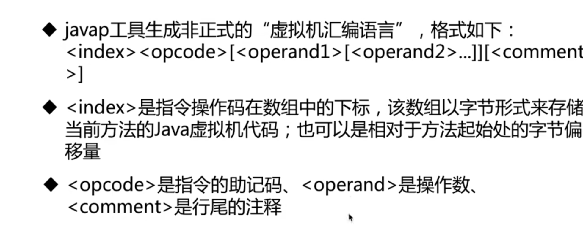 JVM的指令集是基于字节码的,每条指令是由一个字节长度的操作码构成,这个操作码是知名要执行的操作. 有些指令后面会跟随0个或者多个操作数,