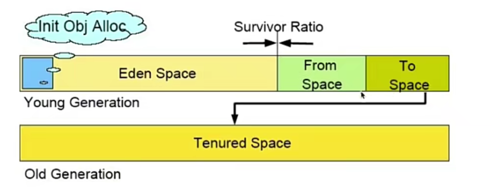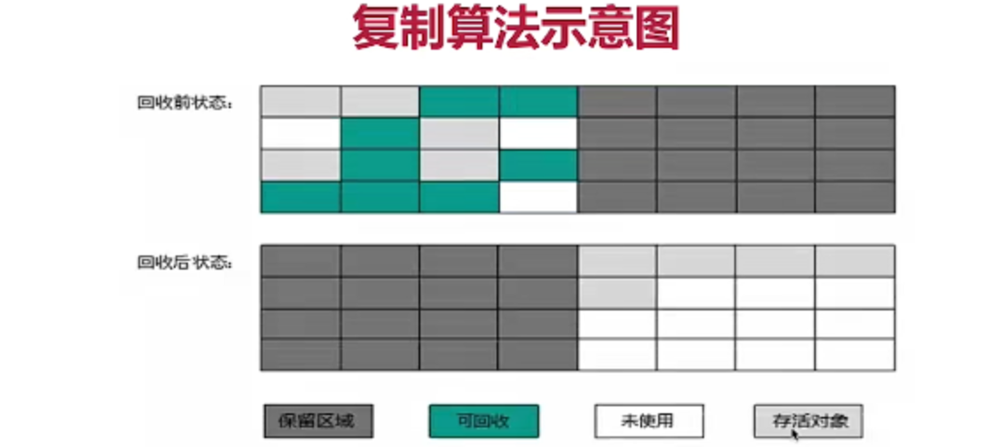 分成两部分 from空间 和 to空间 每次都使用一半 另一半为空闲空间 所有的对象最开始在from空间