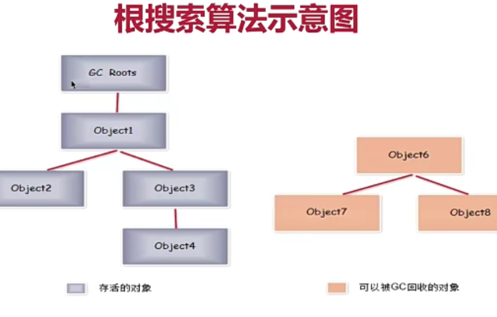 从根节点向下搜索对象节点,搜索走过的路径成为引用链, 当一个对象到根之间没有连通的话,则该对象不可用