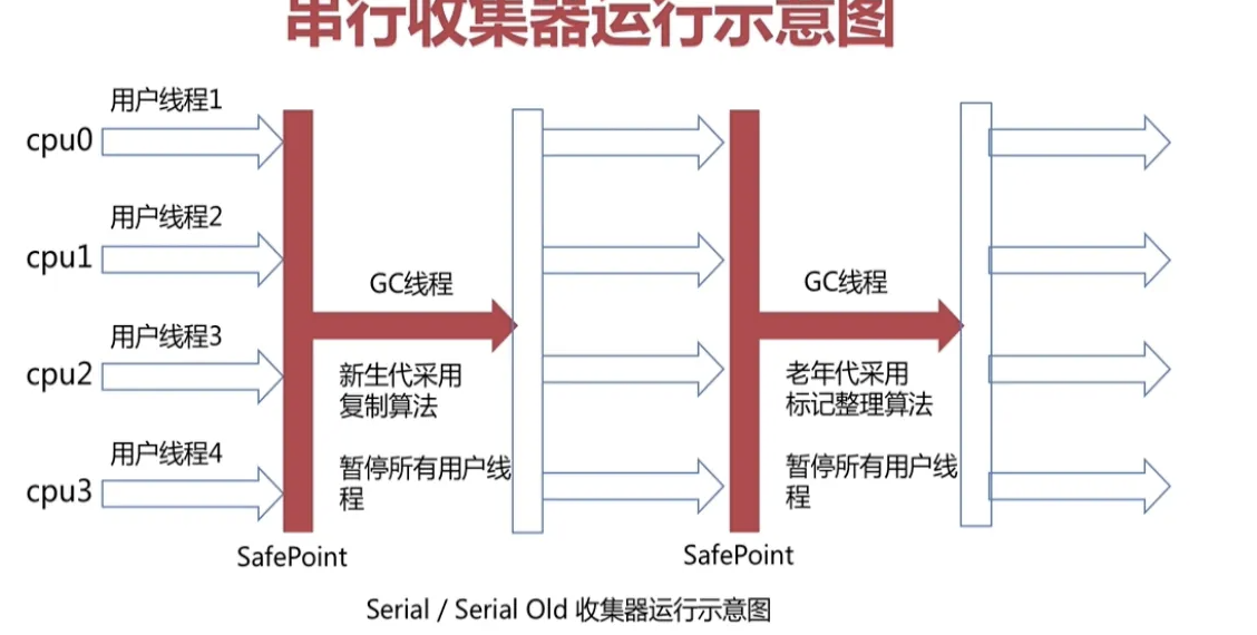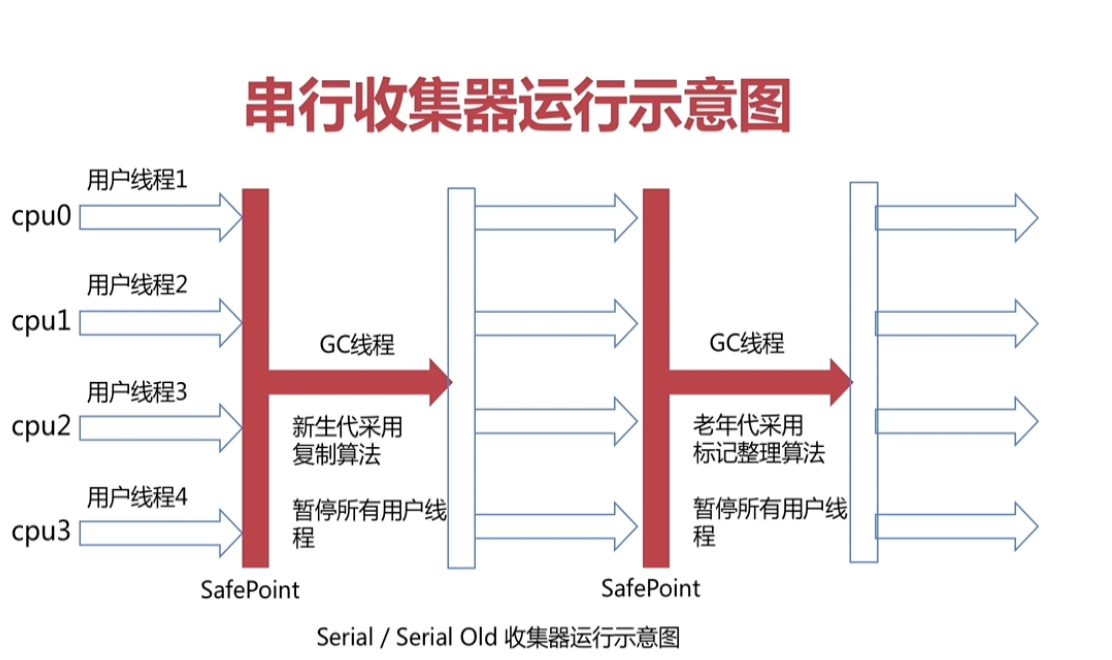 - 单线程垃圾回收器 gc过程中会暂停所有用户线程(Stop-the-World)