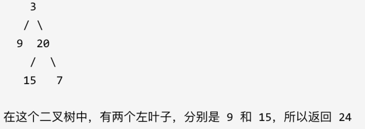 当遇到左叶子节点的时候,记录数值,然后通过递归求取左子树左叶子之和,和 右子树左叶子之和,相加便是整个树的左叶子之和。