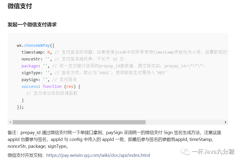 /* 这里我遇到一个大坑,这里的key值是要驼峰式写法,而APP支付却不用!!! */