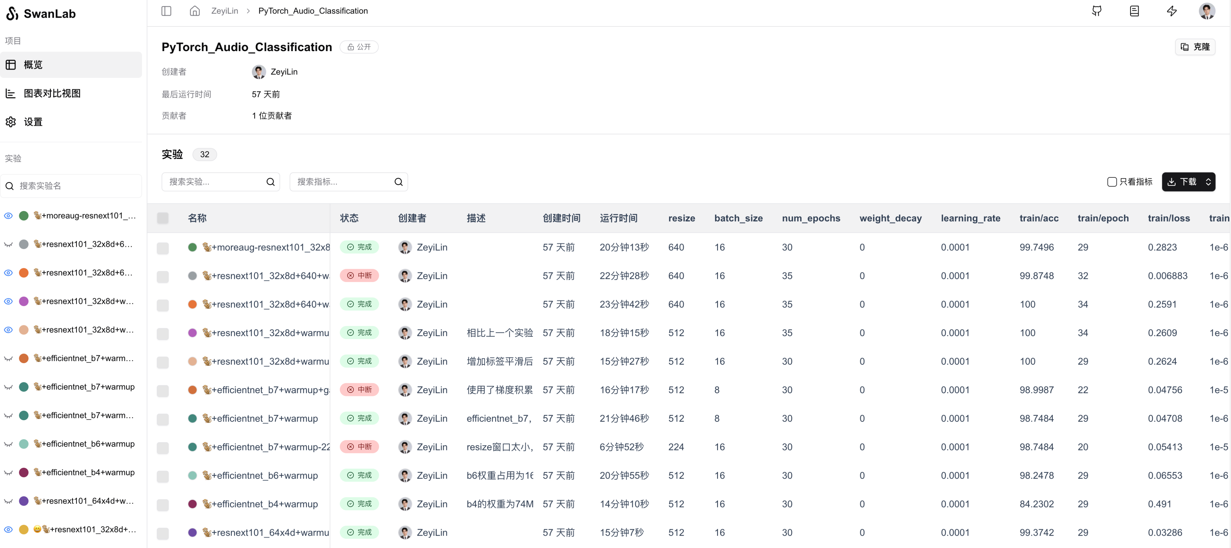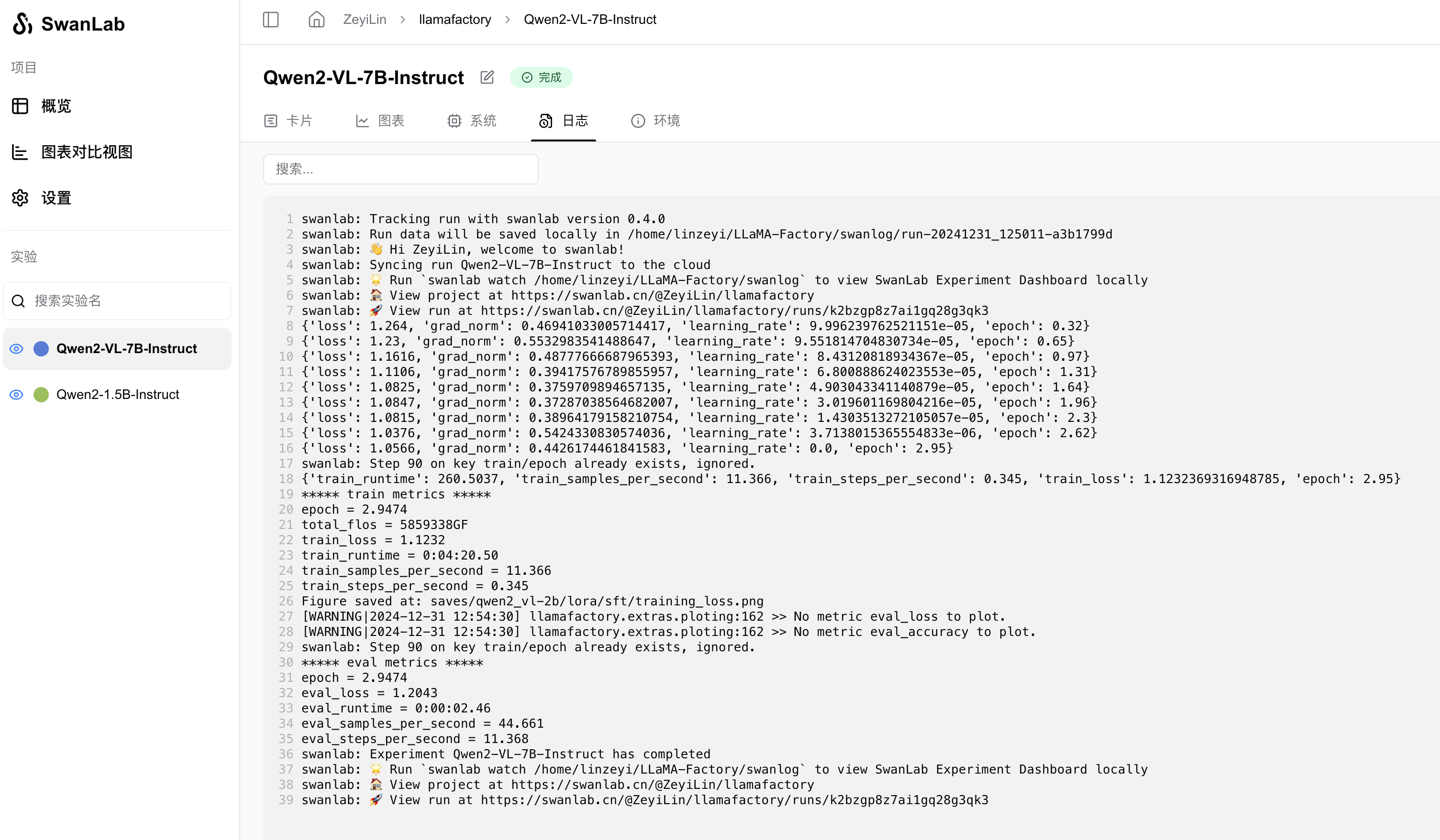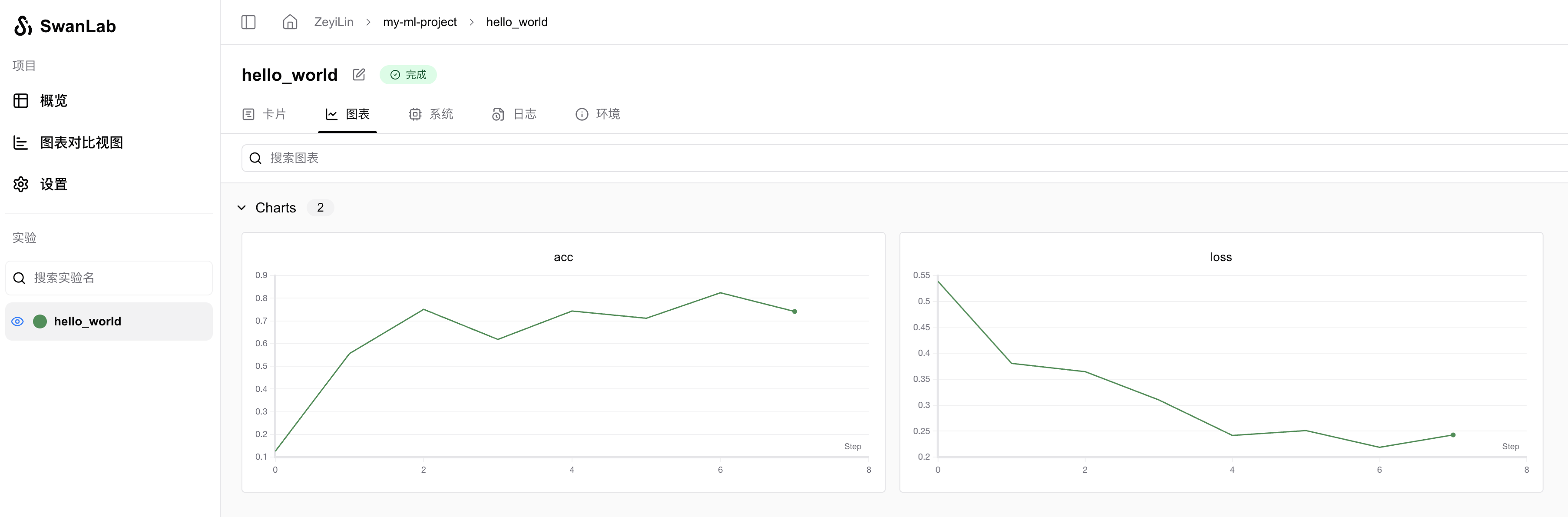运行此程序后,转到 SwanLab 并查看训练过程: