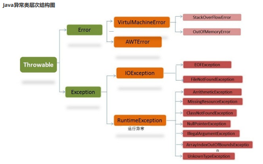 Exception:有个重要子类RuntimeException(运行时异常),由虚拟机抛出异常,比如NullPointerException(要访问的变量没有引用任何对象),ArithmeticException(算术运算符,整除0),ArrayIndexOutOfBoundsException(下标越界)