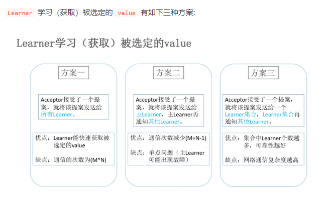 - Learner:Accepter告诉Learner哪个提案被选定,那么Learner就学习这个提案的value