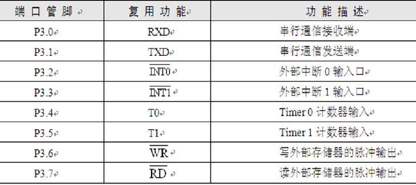 (10)P3口:P3.0—P3.7(第10—17引脚)。 准双向8位多用途I/0口,每个引脚可独立控制,内带上拉电阻,作为第一功能使用时就作普通I/O口,与P1口类似。 作为第二功能使用时,定义如下表: