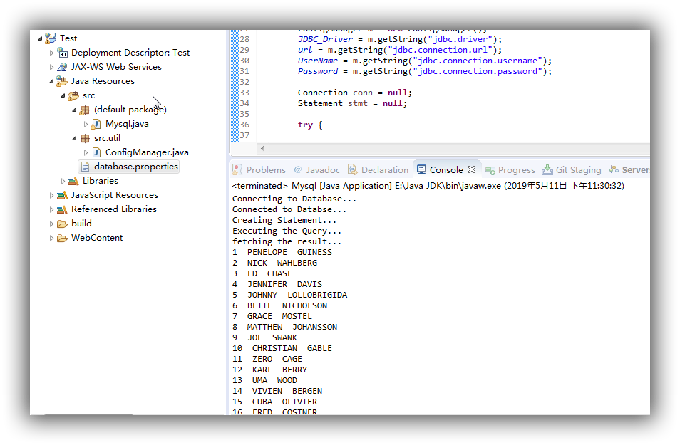 //Step 1, import the needed packages import java.io.IOException; import java.io.InputStream; import java.sql.*; import java.util.Properties; import src.util.ConfigManager; /*USE mysql; ALTER USER 'root'@'localhost' IDENTIFIED WITH mysql_native_password BY '831015'; FLUSH PRIVILEGES; */ public class Mysql { // JDBC driver name and database URL static String JDBC_Driver = null; static String url = null; static String UserName = null; static String Password = null; static final String SQL = "select * from actor"; public static void main(String[] args) throws IOException { ConfigManager m = new ConfigManager(); JDBC_Driver = m.getString("jdbc.driver"); url = m.getString("jdbc.connection.url"); UserName = m.getString("jdbc.connection.username"); Password = m.getString("jdbc.connection.password"); Connection conn = null; Statement stmt = null; try { System.out.println("Connecting to Database..."); Class.forName(JDBC_Driver); conn = DriverManager.getConnection(url, UserName, Password); System.out.println("Connected to Databse..."); System.out.println("Creating Statement..."); stmt = conn.createStatement(); System.out.println("Executing the Query..."); ResultSet rs = stmt.executeQuery(SQL); System.out.println("fetching the result..."); while(rs.next()) { int id = rs.getInt("actor_id"); String name = rs.getString("first_name")+ " "+ rs.getString("last_name"); System.out.println(id + " "+ name); } } catch(SQLException se){ //Handle errors for JDBC se.printStackTrace(); }catch(Exception e){ //Handle errors for Class.forName e.printStackTrace(); }finally{ //finally block used to close resources try{ if(stmt!=null) stmt.close(); }catch(SQLException se2){ }// nothing we can do try{ if(conn!=null) conn.close(); }catch(SQLException se){ se.printStackTrace(); }//end finally try }//end try } }