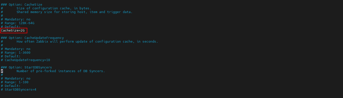 针对该告警,可以编辑配置文件 /etc/zabbix/zabbix_server.conf,将配置文件中 CacheSize 配置参数调大。该值根据主机内存和监测的主机数量进行调整,如果主机内存较大,监测的设备数量多,则将该值调大。