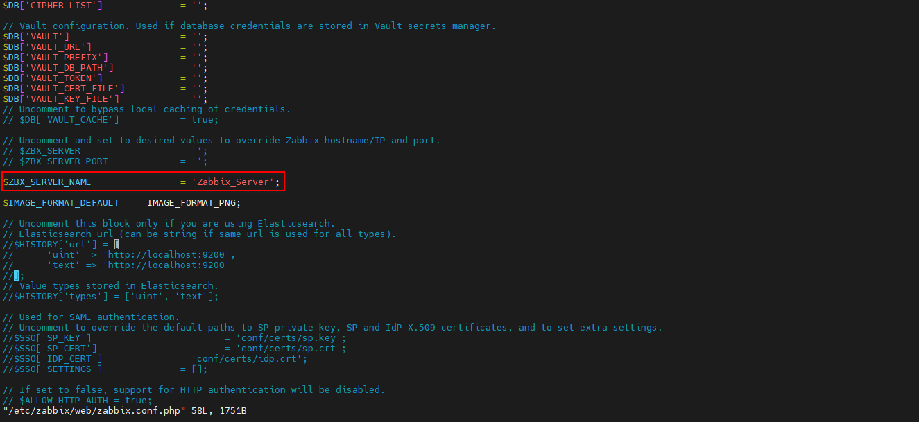 3、将$ZBX_SERVER_NAME参数内值修改为想要的名称,然后保存退出刷新WEB页面即可生效。