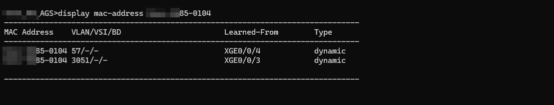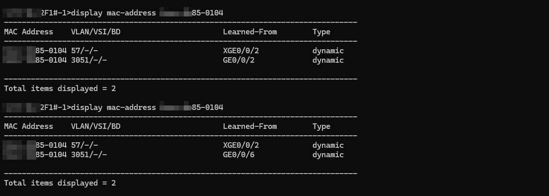 1、向桌面IT得到故障电脑的MAC,在汇聚交换机上通过MAC查询到该MAC分别从两台接入交换机上来且属于不同的VLAN。