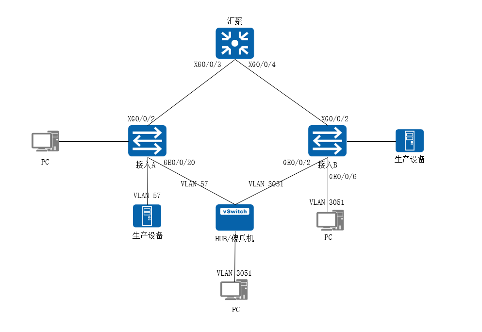 6、由于接入层端口配置了边缘端口、BPDU保护和环路检测,环路检测规则为block,但查看环路检测状态端口却又没有被阻塞,因此可以断定GE0/0/2接口下接了HUB,且该HUB又与接入交换机A相连。也就是说HUB的两个端口和两台不同接入交换机上不同VLAN下的接口相连了,造成了VLAN间的环路。查看接入交换机A与HUB相连的接口,发现接口配置为vlan57。